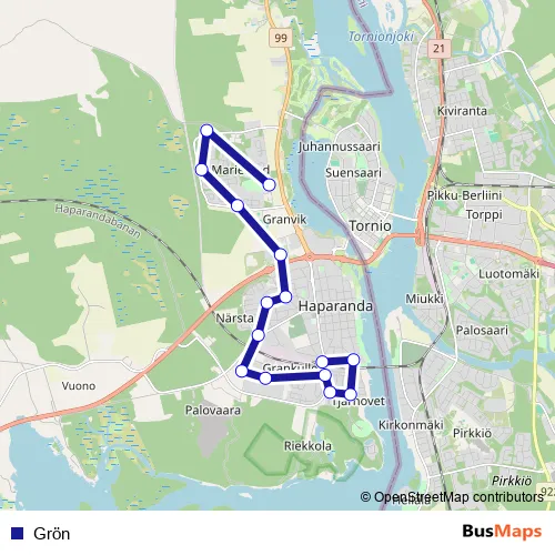 The first stop of the Grön bus route is Haparanda station and the last stop is Marielundsskolan/Språkskolan. Grön is operational during på vardagar.