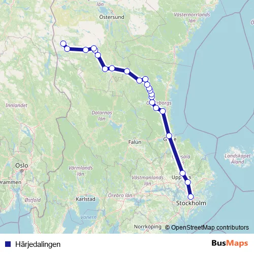 Additional information: Härjedalingen has 21 stops and the total trip duration for this route is approximately 525 minutes.