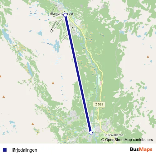 The first stop of the Härjedalingen bus route is Bruksvallarna Stig Myhrs and the last stop is Ramundberget. Härjedalingen (Härjedalingen) is operational during på helger.