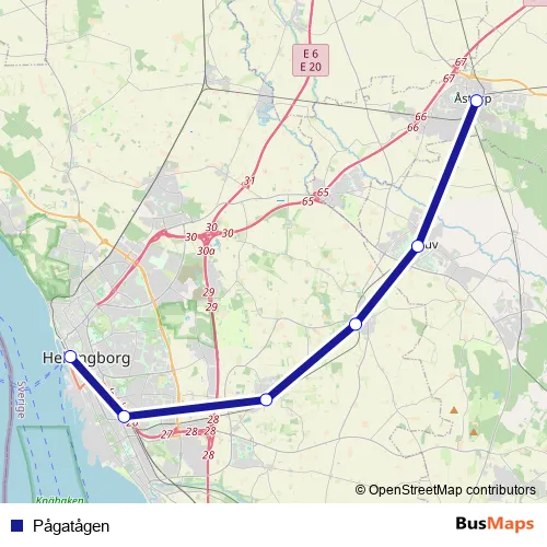 The first stop of the Pågatågen rail route is Åstorp station and the last stop is Helsingborg Centralstation. Pågatågen is operational during på vardagar.