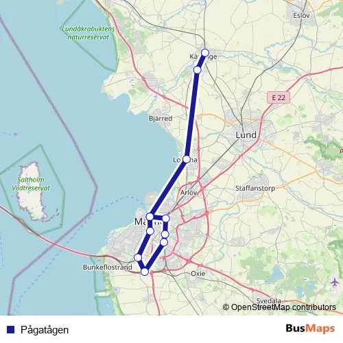 The first stop of the Pågatågen rail route is Malmö Centralstation and the last stop is Kävlinge station. Pågatågen is operational during varje dag.
