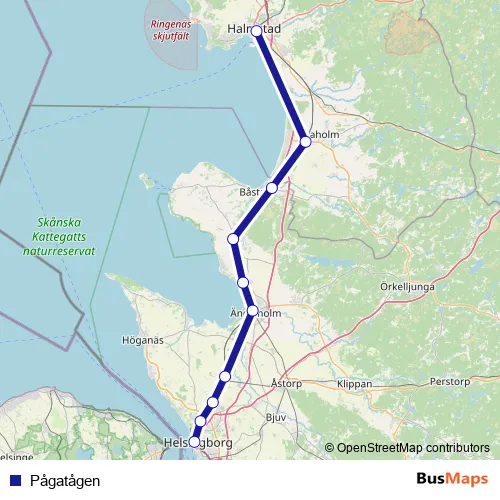 The first stop of the Pågatågen rail route is Helsingborg Centralstation and the last stop is Halmstad Centralstation. Pågatågen is operational during varje dag.