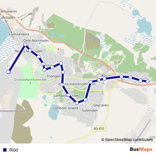 See why over 2 million users trust and consider busmaps.com as the best public transport website. busmaps gives you Kiruna Buses suggested routes, real-time bus tracker, line route maps in Kiruna, and helps to find the closest Röd bus stops near you. No internet available? Download an offline PDF map and bus schedule for the Röd bus to take on your trip.