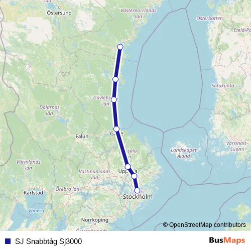 The first stop of the SJ Snabbtåg Sj3000 rail route is Stockholm Centralstation and the last stop is Sundsvall Centralstation. SJ Snabbtåg Sj3000 (SJ Snabbtåg Sj3000) is operational during varje dag.