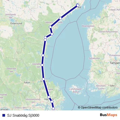 The first stop of the SJ Snabbtåg Sj3000 rail route is Umeå Centralstation and the last stop is Stockholm Centralstation. SJ Snabbtåg Sj3000 (SJ Snabbtåg Sj3000) is operational during varje dag.
