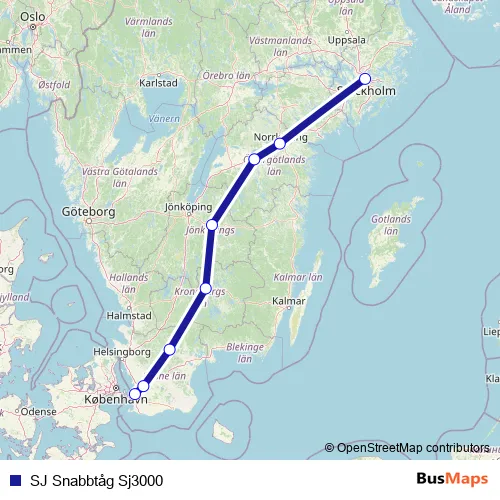 The first stop of the SJ Snabbtåg Sj3000 rail route is Stockholm Centralstation and the last stop is Malmö Centralstation. SJ Snabbtåg Sj3000 (SJ Snabbtåg Sj3000) is operational during varje dag.