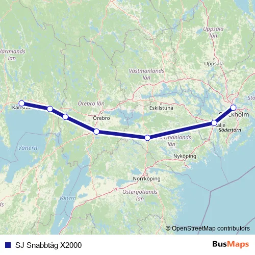 The first stop of the SJ Snabbtåg X2000 rail route is Karlstad Centralstation and the last stop is Stockholm Centralstation. SJ Snabbtåg X2000 (SJ Snabbtåg X2000) is operational during på helger.