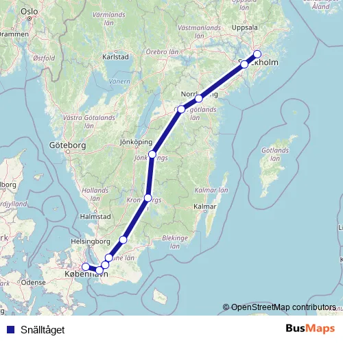 The first stop of the Snälltåget rail route is Köpenhamn H and the last stop is Stockholm Centralstation. Snälltåget is operational during varje dag.