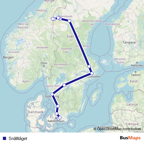 Additional information: Snälltåget has 15 stops and the total trip duration for this route is approximately 975 minutes.