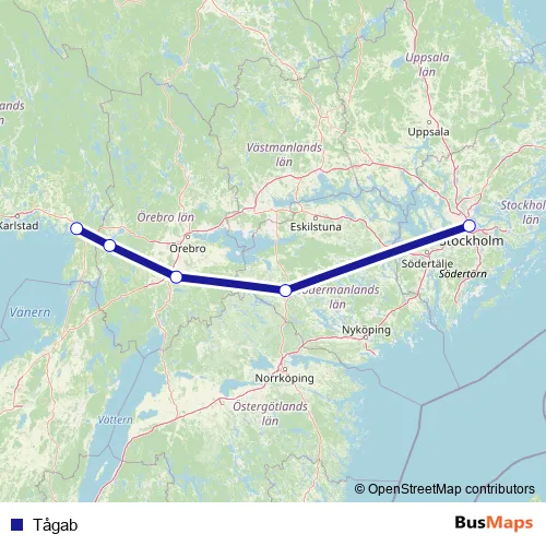The first stop of the Tågab rail route is Kristinehamn station and the last stop is Stockholm Centralstation. Tågab is operational during varje dag.