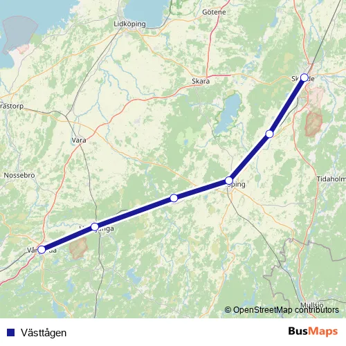 The first stop of the Västtågen rail route is Skövde Centralstation and the last stop is Vårgårda station. Västtågen is operational during varje dag.
