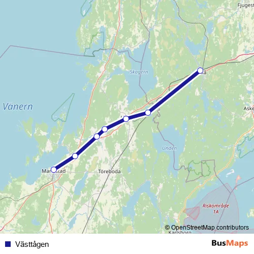 The first stop of the Västtågen rail route is Laxå station and the last stop is