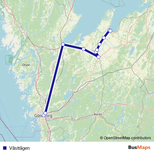 The first stop of the Västtågen rail route is Göteborg Centralstation and the last stop is Lidköping station. Västtågen is operational during varje dag.