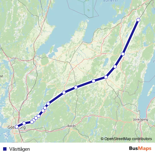 The first stop of the Västtågen rail route is Töreboda station and the last stop is