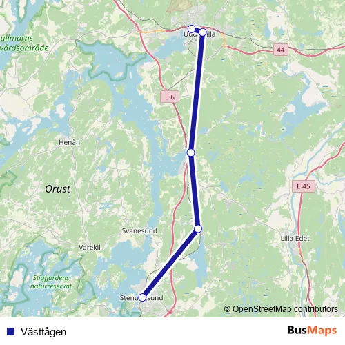 The first stop of the Västtågen rail route is Ljungskile station and the last stop is Stenungsund station. Västtågen is operational during på helger.