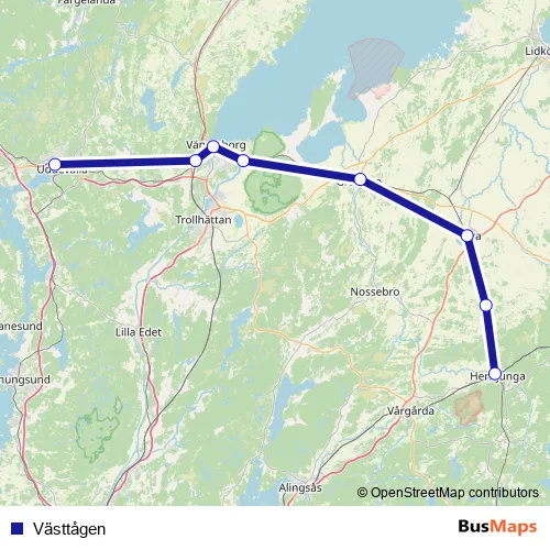 The first stop of the Västtågen rail route is Uddevalla Centralstation and the last stop is Herrljunga station. Västtågen is operational during varje dag.