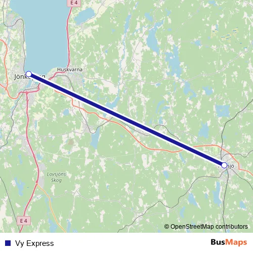 The first stop of the Vy Express bus route is Jönköping Centralstation and the last stop is
