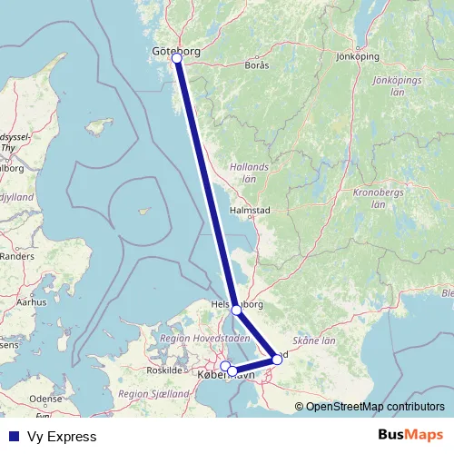 The first stop of the Vy Express bus route is Köpenhamn Dybbölsbro busterm and the last stop is Göteborg Nils Ericsonterminal. Vy Express is operational during varje dag.