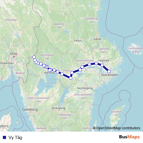 The first stop of the Vy Tåg rail route is Stockholm Centralstation and the last stop is Charlottenberg station. Vy Tåg is operational during varje dag.
