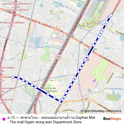 See why over 2 million users trust and consider busmaps.com as the best public transport website. busmaps gives you Lak Si Buses suggested routes, real-time bus tracker, line route maps in Lak Si, and helps to find the closest ต.13 bus stops near you. No internet available? Download an offline PDF map and bus schedule for the ต.13 bus to take on your trip.