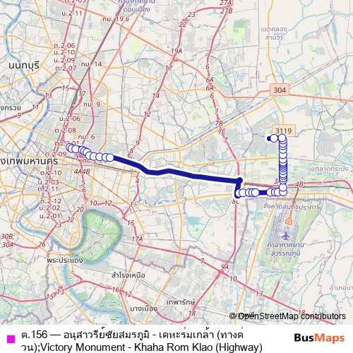 The first stop of the ต.156 bus route is อนุสาวรีย์ชัยสมรภูมิ (เกาะดินแดง);Victory Monument (Din Daeng) and the last stop is ตรงข้ามวัดปากบึง เคหะร่มเกล้า;Wat Pak Bueng (Opposite). ต.156 (อนุสาวรีย์ชัยสมรภูมิ - เคหะร่มเกล้า (ทางด่วน);Victory Monument - Khaha Rom Klao (Highway)) is operational during ทุกวัน.
