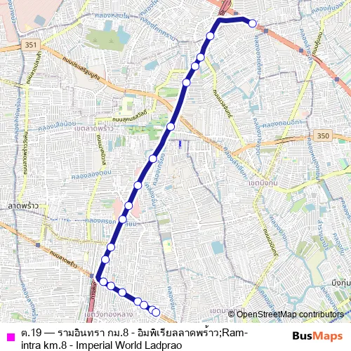 The first stop of the ต.19 bus route is จุดขึ้นลง;visual stop and the last stop is จุดขึ้นลง;visual stop. ต.19 (รามอินทรา กม.8 - อิมพิเรียลลาดพร้าว;Ram-intra km.8 - Imperial World Ladprao) is operational during ทุกวัน.