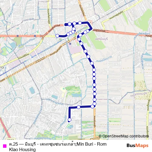 The first stop of the ต.25 bus route is ตลาดจตุจักร 2 มีนบุรี;Chatuchak 2 Market Minburi and the last stop is พรชัยเภสัช;Pornchai Pharmacy. ต.25 (มีนบุรี - เคหะชุมชนร่มเกล้า;Min Buri - Rom Klao Housing) is operational during ทุกวัน.