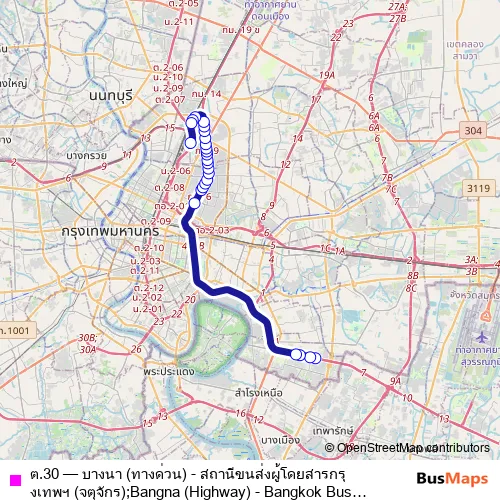 The first stop of the ต.30 bus route is จุดขึ้นลง;visual stop and the last stop is จุดขึ้นลง;visual stop. ต.30 (บางนา (ทางด่วน) - สถานีขนส่งผู้โดยสารกรุงเทพฯ (จตุจักร);Bangna (Highway) - Bangkok Bus Terminal (Chatuchak)) is operational during ทุกวัน.