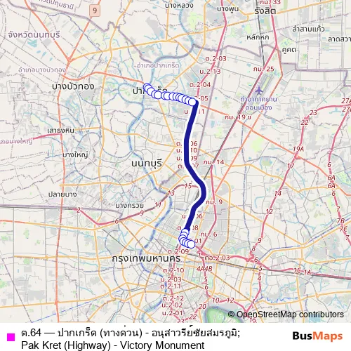The first stop of the ต.64 bus route is จุดขึ้นลง;visual stop and the last stop is อนุสาวรีย์ชัยสมรภูมิ (เกาะพหลโยธิน);Victory Monument (Phahon Yothin). ต.64 (ปากเกร็ด (ทางด่วน) - อนุสาวรีย์ชัยสมรภูมิ;Pak Kret (Highway) - Victory Monument) is operational during ทุกวัน.