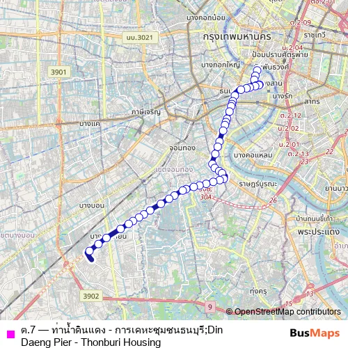 The first stop of the ต.7 bus route is ท่าดินแดง;Din Daeng Pier and the last stop is เคหะธนบุรี (โลตัสพระราม2);Thonburi Housing (Tesco Lotus Rama 2). ต.7 (ท่าน้ำดินแดง - การเคหะชุมชนธนบุรี;Din Daeng Pier - Thonburi Housing) is operational during ทุกวัน.