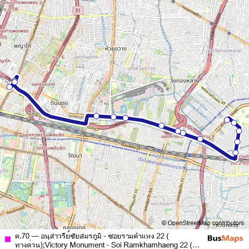 The first stop of the ต.70 bus route is อนุสาวรีย์ชัยสมรภูมิ (เกาะพหลโยธิน);Victory Monument (Phahon Yothin) and the last stop is จุดขึ้นลง;visual stop. ต.70 (อนุสาวรีย์ชัยสมรภูมิ - ซอยรามคำแหง 22 (ทางด่วน);Victory Monument - Soi Ramkhamhaeng 22 (Highway)) is operational during ทุกวัน.