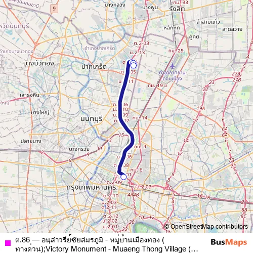 The first stop of the ต.86 bus route is อนุสาวรีย์ชัยสมรภูมิ (เกาะพหลโยธิน);Victory Monument (Phahon Yothin) and the last stop is จุดขึ้นลง;visual stop. ต.86 (อนุสาวรีย์ชัยสมรภูมิ - หมู่บ้านเมืองทอง (ทางด่วน);Victory Monument - Muaeng Thong Village (Highway)) is operational during ทุกวัน.