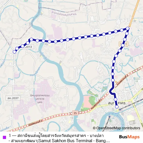 The first stop of the 1 bus route is จุดขึ้นลง;visual stop and the last stop is จุดขึ้นลง;visual stop. 1 (สถานีขนส่งผู้โดยสารจังหวัดสมุทรสาคร - บางปลา - สามแยกพัฒนา;Samut Sakhon Bus Terminal - Bang Pla - Phatthana Intersection) is operational during ทุกวัน.