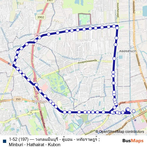 The first stop of the 1-52 (197) bus route is ตลาดเก่ามีนบุรี;Minburi Old Market and the last stop is อู่มีนบุรี;Minburi Terminal. 1-52 (197) (วงกลมมีนบุรี - คู้บอน - หทัยราษฎร์ ;Minburi - Hathairat - Kubon) is operational during ทุกวัน.