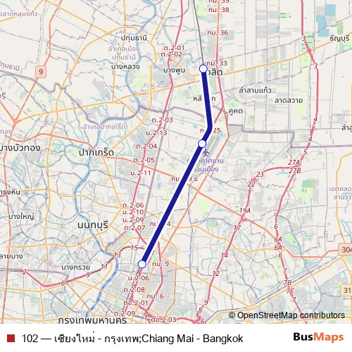 The first stop of the 102 rail route is SRT รังสิต;Srt Rangsit and the last stop is SRT กรุงเทพอภิวัฒน์;Srt Bangkok (Krung Thep Aphiwat). 102 (เชียงใหม่ - กรุงเทพ;Chiang Mai - Bangkok) is operational during ทุกวัน.