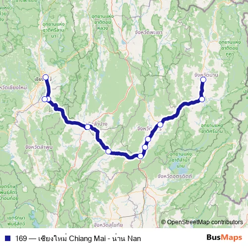 The first stop of the 169 bus route is เชียงใหม่ Chaing Mai and the last stop is น่าน Nan. 169 (เชียงใหม่ Chiang Mai - น่าน Nan) is operational during ทุกวัน.
