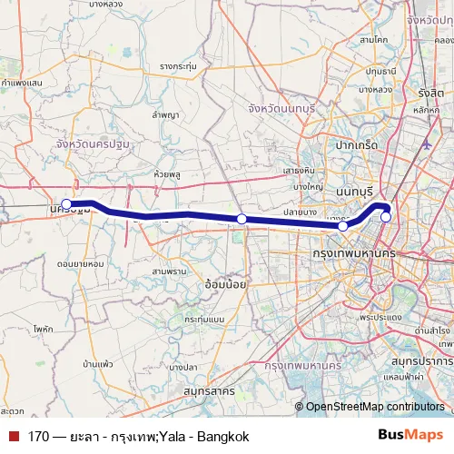 The first stop of the 170 rail route is SRT นครปฐม;Srt Nakhon Pathom and the last stop is SRT กรุงเทพอภิวัฒน์;Srt Bangkok (Krung Thep Aphiwat). 170 (ยะลา - กรุงเทพ;Yala - Bangkok) is operational during ทุกวัน.