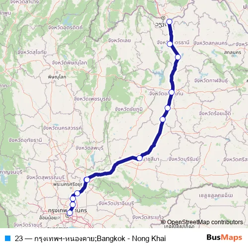 The first stop of the 23 bus route is สถานีขนส่งผู้โดยสารกรุงเทพ จตุจักร (หมอชิต 2);Small Bus Terminal (Chatuchak) (Mo Chit 2) and the last stop is สถานีขนส่งผู้โดยสาร จ.หนองคาย;Nong Khai Passenger Transport Station. 23 (กรุงเทพฯ-หนองคาย;Bangkok - Nong Khai) is operational during ทุกวัน.