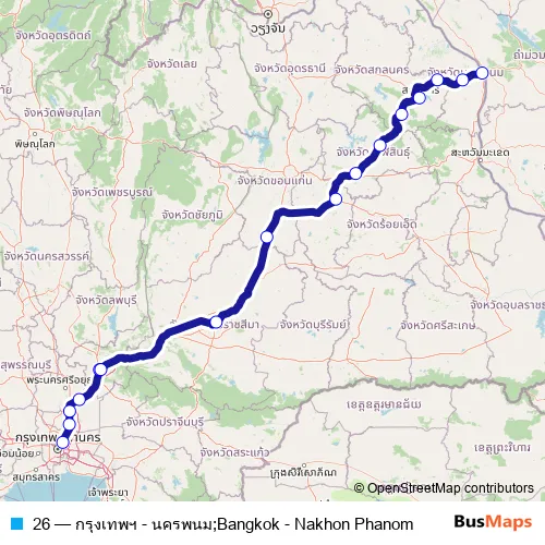 The first stop of the 26 bus route is สถานีขนส่งผู้โดยสารกรุงเทพ จตุจักร (หมอชิต 2);Small Bus Terminal (Chatuchak) (Mo Chit 2) and the last stop is สถานีขนส่งผู้โดยสาร จ.นครพนม;Nakhon Phanom Bus Terminal. 26 (กรุงเทพฯ - นครพนม;Bangkok - Nakhon Phanom) is operational during ทุกวัน.