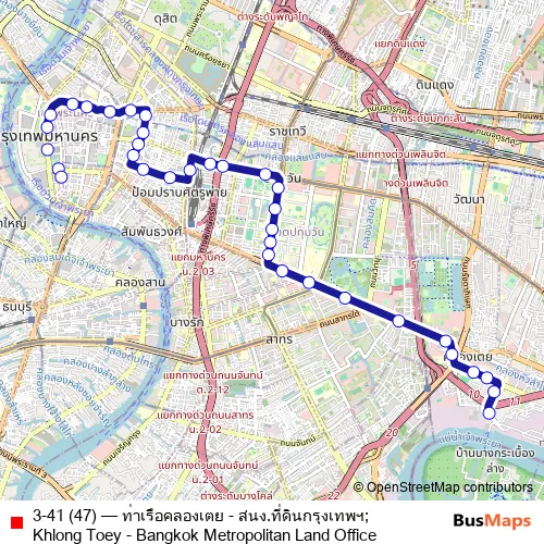 Services on the 3-41 (47) - ท่าเรือคลองเตย - สนง.ที่ดินกรุงเทพฯ;Khlong Toey - Bangkok Metropolitan Land Office bus stop at 22:36 on วันจันทร์, วันอังคาร, วันพุธ, วันพฤหัสบดี, วันศุกร์, วันเสาร์, วันอาทิตย์.