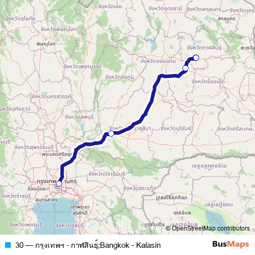 The first stop of the 30 bus route is สถานีขนส่งผู้โดยสารกรุงเทพ จตุจักร (หมอชิต 2);Small Bus Terminal (Chatuchak) (Mo Chit 2) and the last stop is สถานีขนส่งผู้โดยสาร จ.กาฬสินธุ์;Kalasin Passenger Transport Station. 30 (กรุงเทพฯ - กาฬสินธุ์;Bangkok - Kalasin) is operational during ทุกวัน.