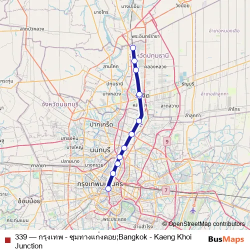 The first stop of the 339 rail route is SRT กรุงเทพ;Srt Bangkok and the last stop is SRT นวนคร;Srt Nava Nakhon. 339 (กรุงเทพ - ชุมทางแก่งคอย;Bangkok - Kaeng Khoi Junction) is operational during วันหยุดสุดสัปดาห์.