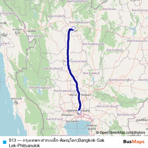 The first stop of the 913 bus route is สถานีขนส่งผู้โดยสารกรุงเทพ จตุจักร (หมอชิต 2);Small Bus Terminal (Chatuchak) (Mo Chit 2) and the last stop is สถานีขนส่งผู้โดยสาร จ.พิษณุโลก แห่งที่ 2;Phitsanulok Bus Terminal 2. 913 (กรุงเทพฯ-สากเหล็ก-พิษณุโลก;ฺBangkok-Sak Lek-Phitsanulok) is operational during ทุกวัน.
