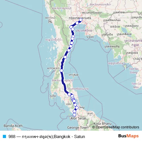 The first stop of the 988 bus route is สถานีขนส่งผู้โดยสารกรุงเทพ จตุจักร (หมอชิต 2);Small Bus Terminal (Chatuchak) (Mo Chit 2) and the last stop is สถานีขนส่งผู้โดยสาร จ.สตูล;Satun Passenger Transport Station. 988 (กรุงเทพฯ-สตูล(ข);Bangkok - Satun) is operational during ทุกวัน.