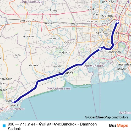The first stop of the 996 bus route is สถานีขนส่งจังหวัดสมุทรสงคราม;Samut Songkhram Bus Terminal and the last stop is สถานีขนส่งหมอชิต 2 (ชานชาลาขาเข้า);Mo Chit 2 Bus Terminal (arrival platform). 996 (กรุงเทพฯ - ดำเนินสะดวก;Bangkok - Damnoen Saduak) is operational during ทุกวัน.