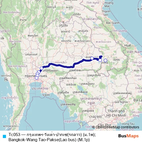 The first stop of the Tc053 bus route is สถานีขนส่งผู้โดยสารนครปากเซ;Vanilla Bus Terminal, Pakse City and the last stop is สถานีขนส่งหมอชิต 2 (ชานชาลาขาเข้า);Mo Chit 2 Bus Terminal (arrival platform). Tc053 (กรุงเทพฯ-วังเต่า-ปากเซ(รถลาว) (ม.1พ);Bangkok-Wang Tao-Pakse(Lao bus) (M.1p)) is operational during ทุกวัน.