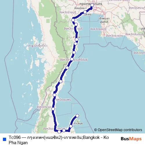 The first stop of the Tc096 bus route is สถานีขนส่งผู้โดยสารกรุงเทพ จตุจักร (หมอชิต 2);Small Bus Terminal (Chatuchak) (Mo Chit 2) and the last stop is เกาะพะงัน ท่าเรือท้องศาลา;Koh Phangan, Thong Sala Pier. Tc096 (กรุงเทพฯ(หมอชิต2)-เกาะพะงัน;Bangkok - Ko Pha Ngan) is operational during ทุกวัน.