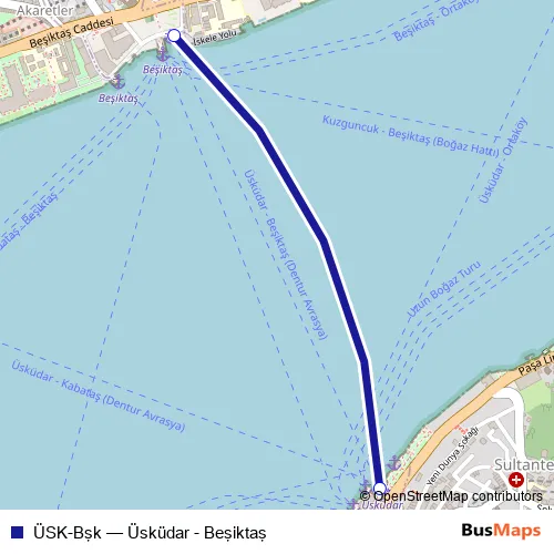 The first stop of the ÜSK-Bşk ferry route is Beşiktaş Dentur and the last stop is Üsküdar Dentur. ÜSK-Bşk (Üsküdar - Beşiktaş) is operational during her gün.