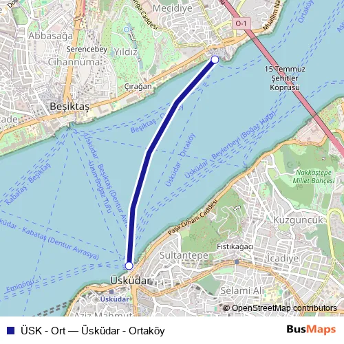 The first stop of the ÜSK - Ort ferry route is Ortaköy Şh. and the last stop is Üsküdar Şh.. ÜSK - Ort (Üsküdar - Ortaköy) is operational during hafta içi.