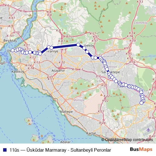 The first stop of the 11üs bus route is Üsküdar Marmaray and the last stop is Sultanbeyli Peronlar. 11üs (Üsküdar Marmaray - Sultanbeyli Peronlar) is operational during her gün.